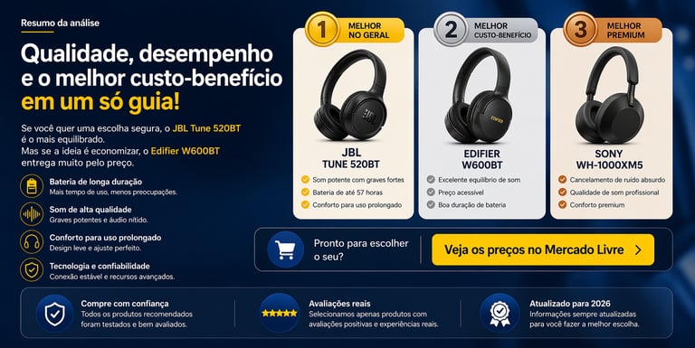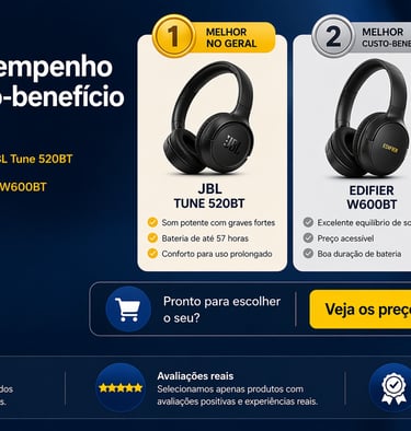 Se você quer uma escolha segura, o JBL Tune 520BT é o mais equilibrado. Mas se a ideia é economizar, o Edifier W600BT entrega muito pelo preço.